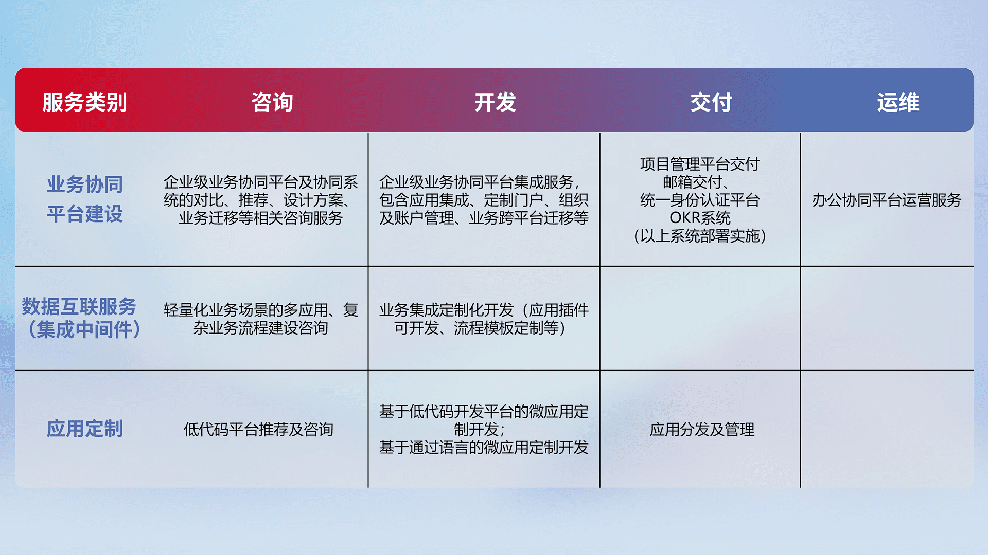 针对钉钉、、企微、、、IDaas等平台级产品提供产品的规划、、、方案、、交付、、、、定制化开发等服务,,实现如统一协同办公、、、智能客户服务、、混合会议管理、、、、智能数据查询、、、等业务场景,,实现数字化转型。。